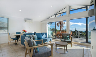Accommodating up to four guests, the living area of each Seaview Villa opens out onto an impressive private deck with spectacular views of Palm Beach, Mawhitipana Bay & the greater Hauraki Gulf.